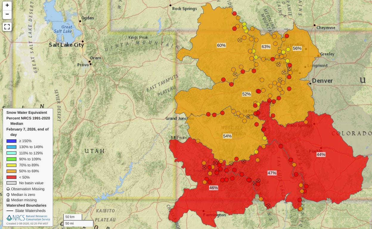 As the temperatures climb to 60 degrees again today, and the Gunnison Basin’s snowpack – at 54% yesterday – continues to shrink, the fears of exceptional drought, broad agricultural loss and catastrophic wildfire become acute.